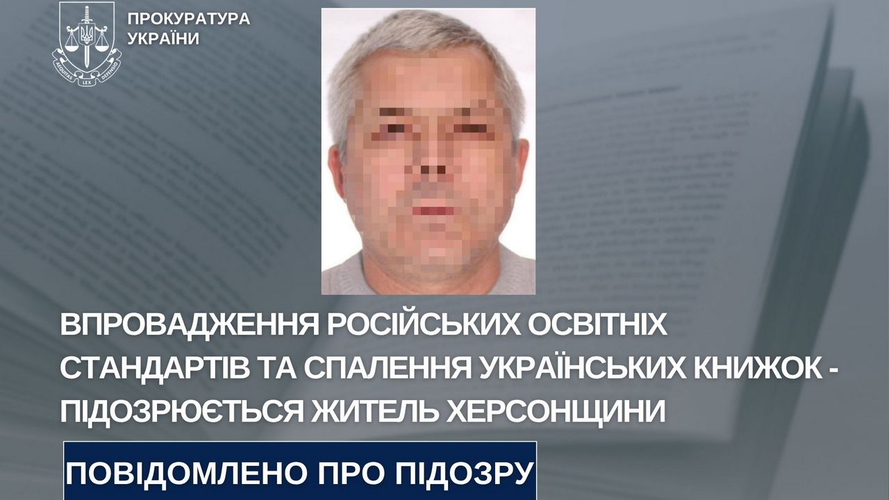 Херсонська обласна прокуратура заочно повідомила жителю регіону про підозру у впровадженні освітніх стандартів держави-агресора та пособництві їй. Йому інкримінують порушення за ч. 3 ст. 111-1 та ч. 1 ст. 111-2 Кримінального кодексу України.