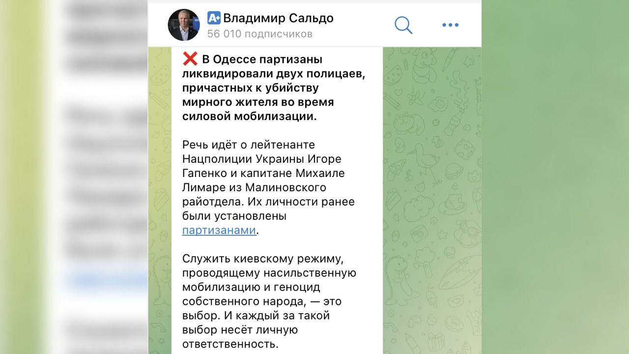 У повідомленні йдеться, що це сталося внаслідок дій так званих “партизанів”, які буцімто ліквідували правоохоронців, причетних до “силової мобілізації”. Фігурують імена лейтенанта Ігоря Гапенка та капітана Михайла Лимари з Малиновського райвідділу поліції.