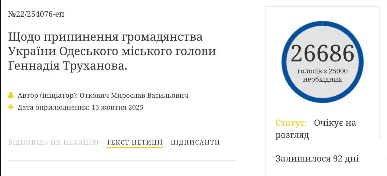 Петиція з вимогою позбавити мера Одеси Геннадія Труханова громадянства України за добу зібрала необхідні 25 тис підписів.