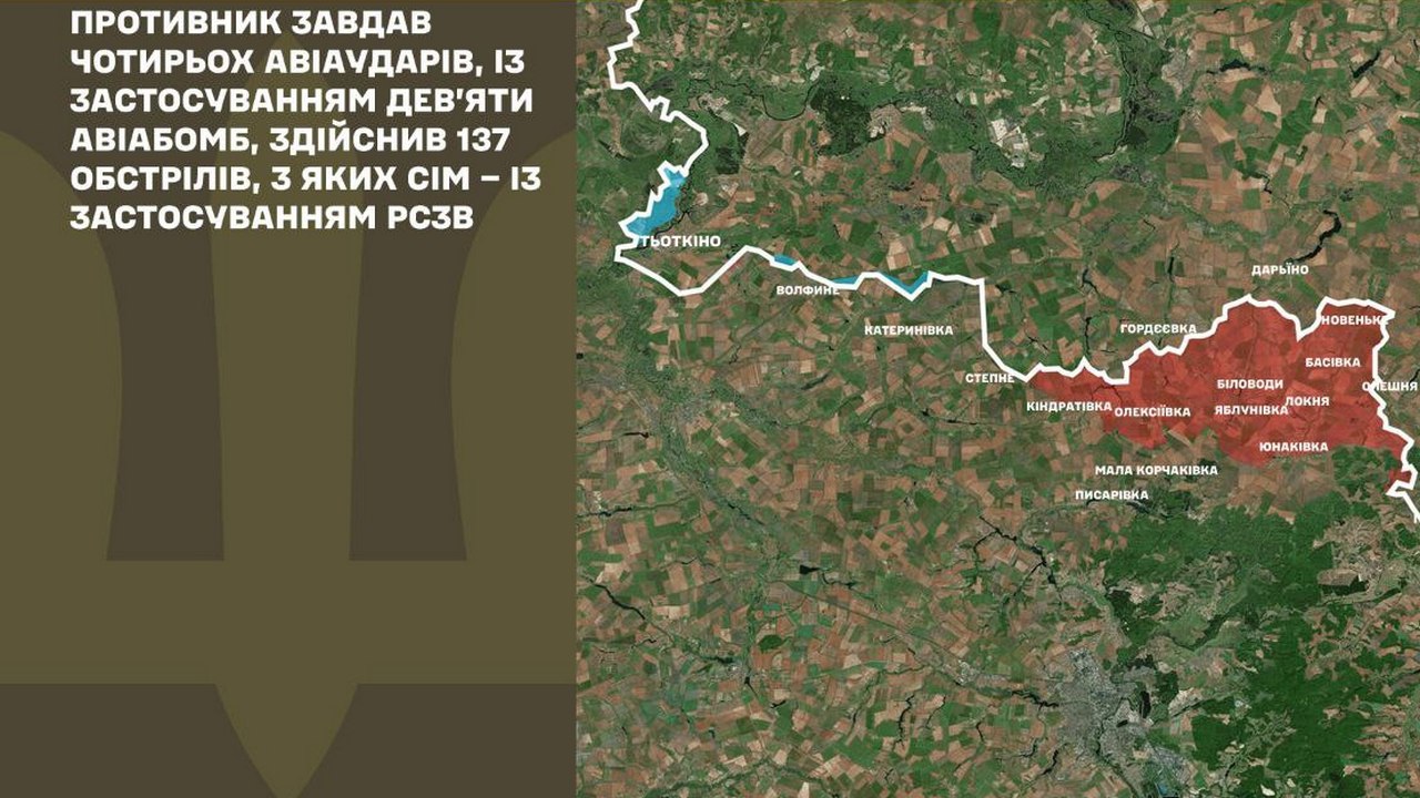 За даними військових, противник завдав 84 авіаційних ударів та скинув 282 керовані авіабомби. Крім того, застосував 8437 дронів-камікадзе та здійснив 3645 обстрілів позицій українських військ і населених пунктів, зокрема 78 – із реактивних систем залпового вогню. Авіація, ракетні війська й артилерія Сил оборони уразили вісім районів зосередження живої сили та пункт управління БпЛА окупантів.